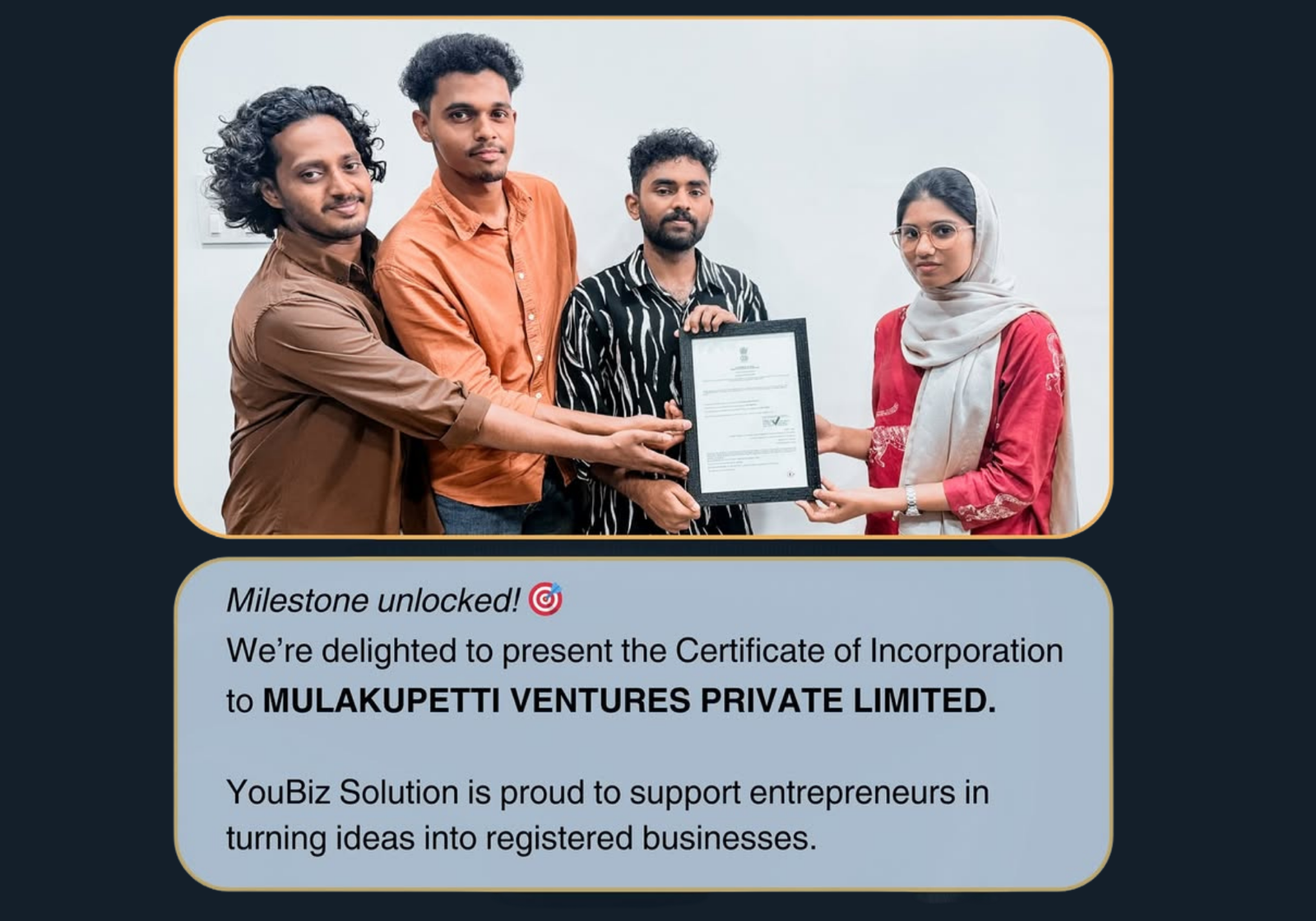 "Mr. Siddique from YouBiz Solutions provided excellent support for company registration, GST, and government processes. His guidance was clear, professional, and efficient throughout. The entire journey was smooth and stress-free. Highly recommended for dependable startup and compliance assistance."